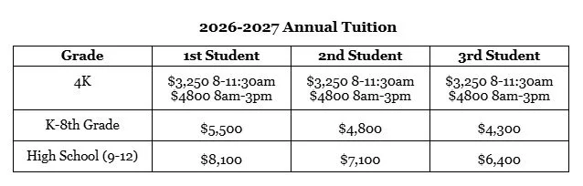 Do you need help making tuition payments? It is the priority of the school to keep tuition affordable, and we wish for no student to be turned away due to financial limitations. Financial aid is available--please request an application from the office. Financial aide applications for the 2026-2027 school year are due by Monday, May 4, 2026.